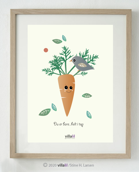 Kort med sødt sommerligt motiv af gulerod og fugl. Sart lysegul m. teksten "Du er bare..helt i top" Enkelt kort.