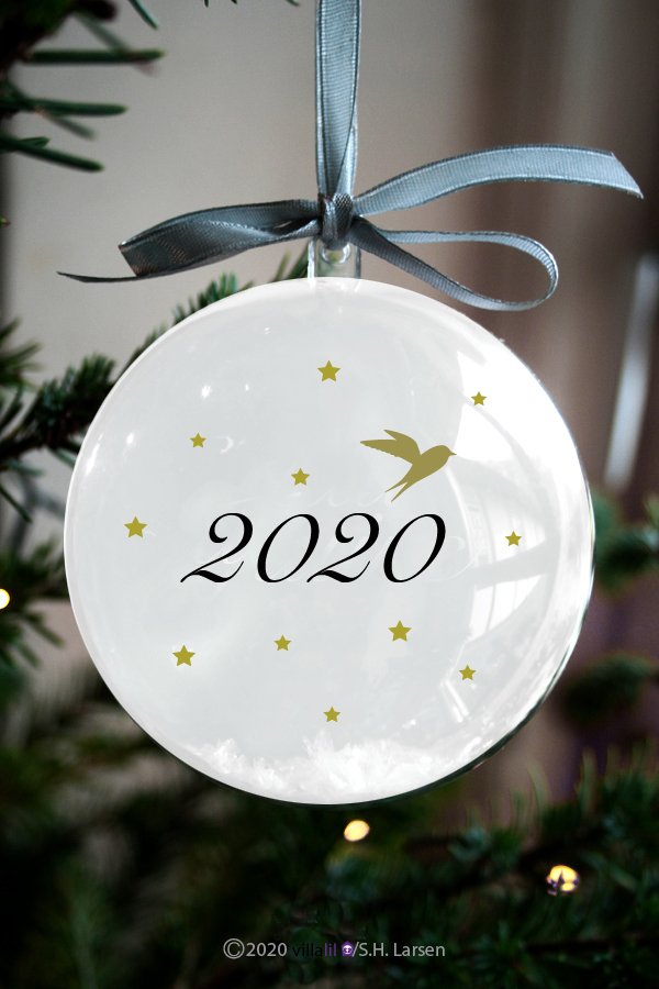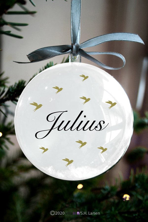 Barnets - eller mosterens - eller...? egen personlige julekugle. På forsiden er der navn. På bagsiden valgfri kort tekst fx "god jul" og /eller årstal og en enkelt svale. Et lille drys sne pynter indeni kuglen.