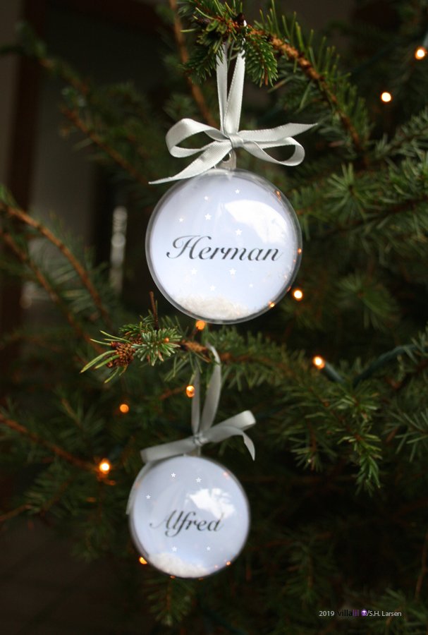 Barnets - eller mosterens - eller...? egen personlige julekugle. Med navn på den ene side, og valgfrit årstal på bagsiden. Et lille drys sne pynter indeni kuglen.