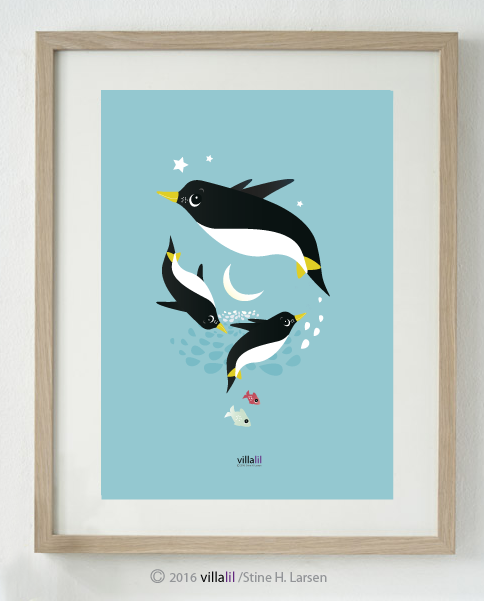 Over the moon..legesyge pingviner. Lys blå baggrund. Enkelt kort.