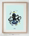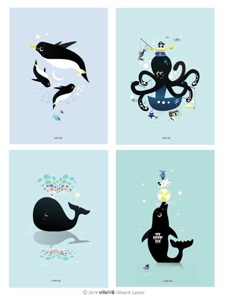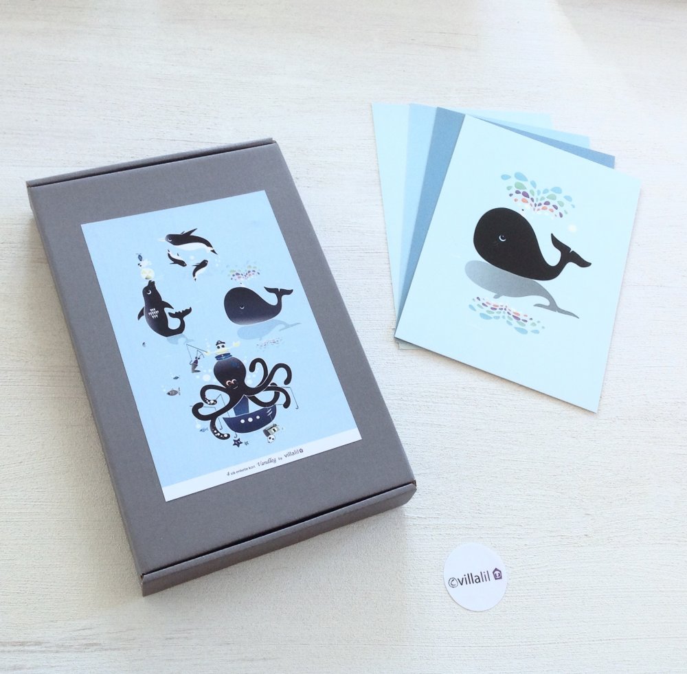 Pakke med 4 stk kort med havets legende dyr. Enkelte kort med kuverter. Fine til en rammevæg på børneværelset!