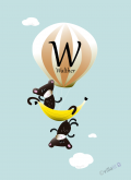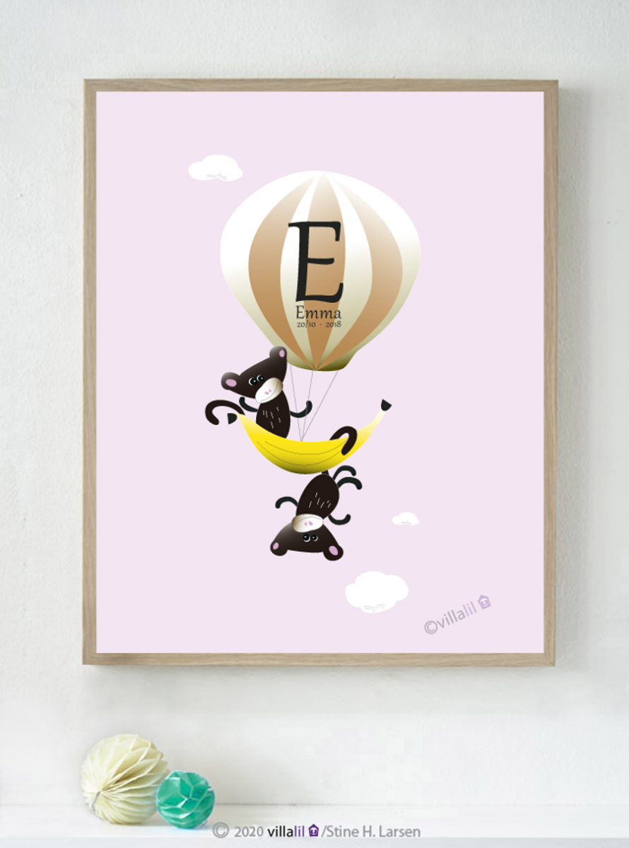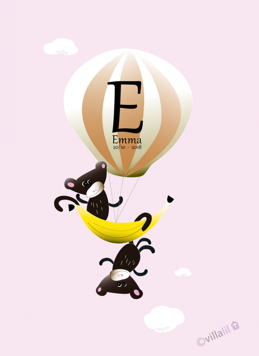 Navneplakat med søde aber på eventyr. Vælg mellem mint eller lyserød.