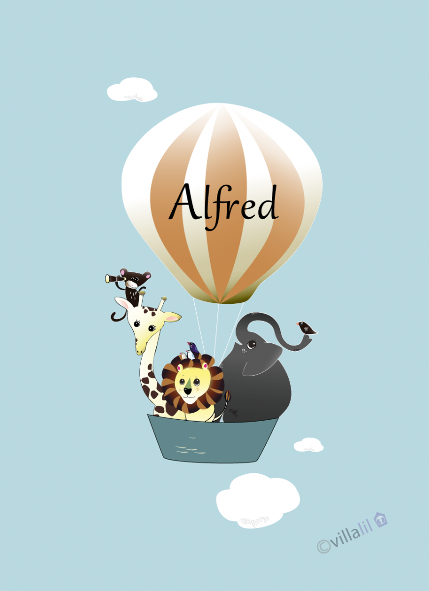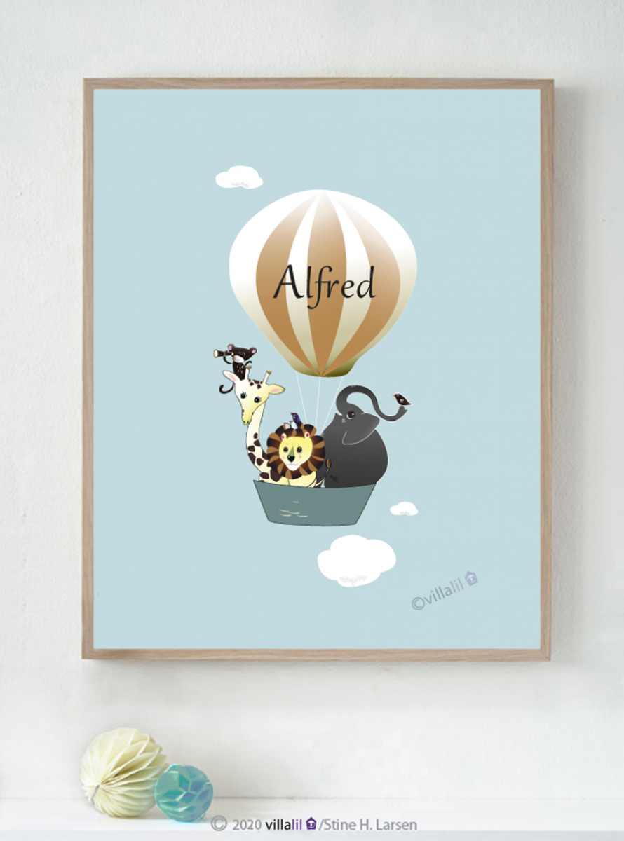 Navneplakat med søde dyr på eventyr i luftballon. Vælg mellem mint, lyseblå eller lyserød. Billede: lys blå